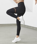 Opaque, stretch fabric. Deep waistband with inner pocket. Fine mesh panels on front and back thigh. Laser cut panels at lower calves, front and back. Tombo tear-out label.
