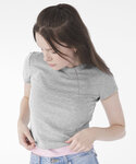 Crew neck binding. Mid-length. 1x1 micro rib. Fitted. Stretch fit. Set-in cap sleeves. Pre-shrunk. Side-seamed.