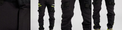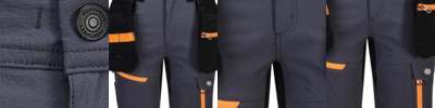 Titanmill Pro stretch: 93% Polyester, 7% Elastane. Four-way stretch fabric for ease of movement and added comfort. High-rise back waistband ensures protection in all working positions. Reflective trim for increased visibility and safety. Zip-off holster pockets for added versatility. Two-tier kneepad pockets offer two positioning options. Multiple side zip compartments for secure storage. 16 pockets for ample storage. Two side zip pockets for secure storage. Smartphone pocket. Hammer loop for secure storage of work tools. Two back pockets. Two zipped thigh pockets. CorePro reinforced thigh pocket. Welt pocket. CorePro reinforced holster pockets with webbing loops for tools. Stretch crotch gusset provides maximum flexibility and reduces stress. Side elastic waist for ultimate wearer comfort. Webbing belt loops for extra durability. D-ring for keys or ID cards. Bartacked at all stress points. Pre-bent knees allow for increased freedom of movement. Triple-stitched seams for extra durability. Extendable leg length (31" to 33"). Slim fit design for exceptional comfort.