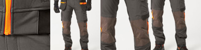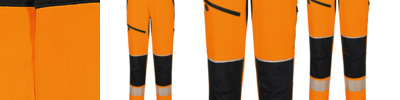 Texpel™ Stain Eco premium stain-resistant finish to repel grime and water. Four-way stretch fabric for ease of movement and added comfort. Stretch crotch gusset provides maximum flexibility and reduces stress. Double-layer reinforced knee protection for extra strength and durability. Adjustable hem – regular to long leg. Side pockets. Handy zipped side thigh pockets. Two back pockets with flap and stud closure. Key loop in pocket. Contrast panels for protection against dirt. Side elastic waist for ultimate wearer comfort. Heat-applied segmented reflective tape for added visibility. Six pockets for ample storage. Certified to EN ISO 20471 after 25 washes. CE certified.