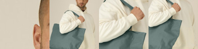 100% Recycled cotton canvas (open end). Woven shopping bag. Folded hem at top edge. Hidden snap closure. Bottom and side soufflé. Long and short self-fabric handles with cross-stitch for reinforcement. Inside self-fabric pocket. Herringbone tape on inside seams for a clean finish. Single-needle stitch at top edge.