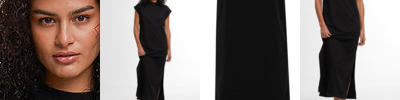 Loose straight fit. Dropped shoulders. Folded sleeve hem. Ends below the calf. Long side slits. High ribbed crew neck.