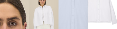 Women’s boxy shirt. Shirt collar with collar stand. Grown-on placket with single-needle topstitching on each side. Back yoke with twin-needle stitching. Forwarded shoulder seam with twin-needle stitching. Dropped shoulders. Square cuffs with single-button opening. Cuff placket with button opening. Shaped hem with side vents. Dipped back panel. Double pleats at cuff. Contains 100% certified organic cotton.