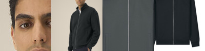 Unisex high-neck zip-through sweatshirt. Set-in sleeves. Self-fabric high-neck collar. Inside herringbone back neck tape. Self-fabric half-moon at the back neck. Metal zip at centre front. Welt pockets. 1x1 rib at sleeve cuffs and hem. Contains certified organic cotton and recycled polyester.