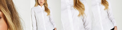 Soft fused mandarin collar. Easy iron. Concealed placket. Two front darts. Two back darts. Side vents. Single needle stitched yoke and armholes. Shirt tail hem. Spare button. Woven label.