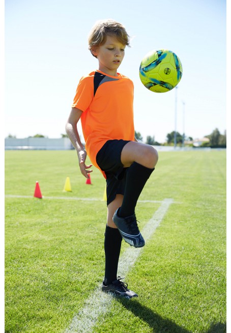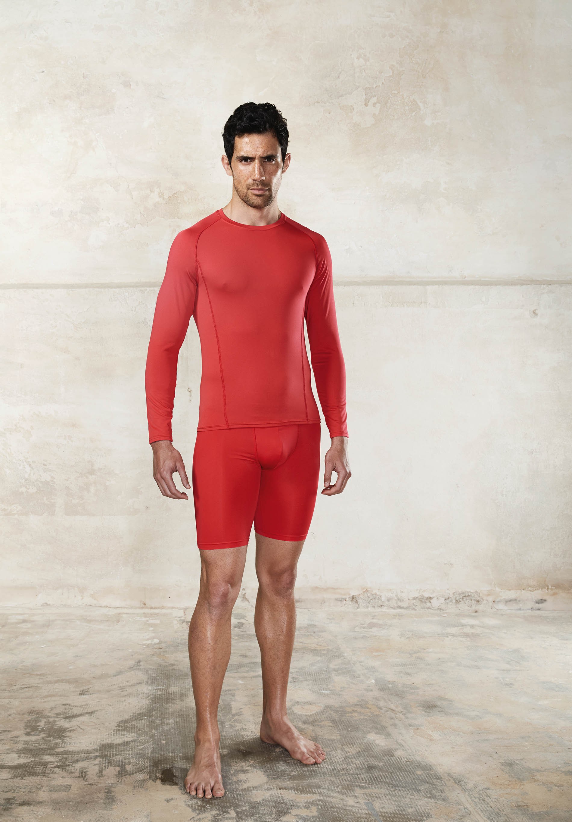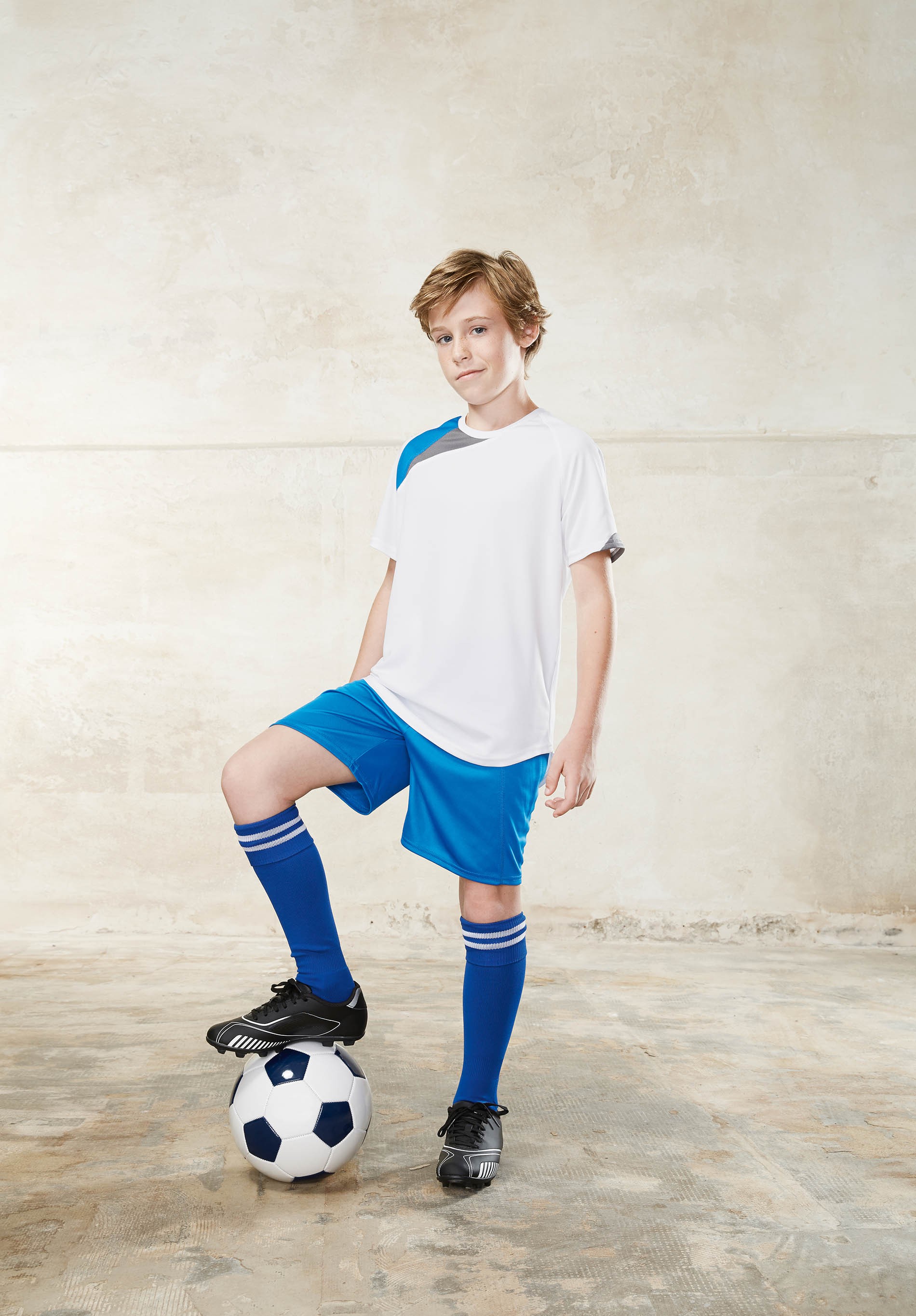 100% polyester. Sneldrogende stof. Inzetstukken in contrastkleur op de borst en mouwuiteinde. Overstiksels toon op toon. Afwerking met dubbele stiksels onderaan en aan de mouwuiteinden.
