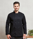 Long sleeve chef’s jacket. Superior overall comfort. Soft hand feel. Mandarin Collar stand with topstitching. Removable studs. Unisex styling. Comes with black studs (other colours available see PR652) 60 degrees domestic wash. 10 hole wrap over fastening. Turn back split cuff.