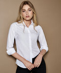 Fused soft stand-up collar (no stiffeners). 7-button placket with self-coloured buttons. Rounded hem. back yoke. Single stitching around armholes. Double-stitched sleeves and side seams. Under bust darts. Back darts from hem to under arm point. Spare button. Kustom Kit® woven back neck label.